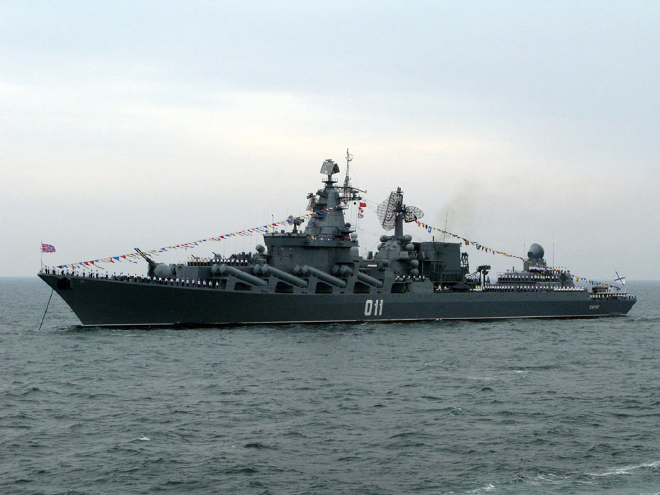 4月23日下午,為紀念中國人民解放軍海軍成立60周年而舉行的海上閱兵在青島附近黃海海域舉行。圖為舷號011俄羅斯“瓦良格”號導(dǎo)彈巡洋艦。 中新社發(fā) 琥珀旺旺 攝