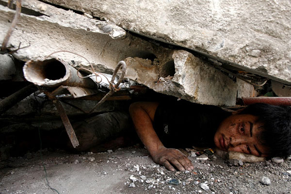 2008年5月15日,在四川省北川縣城的廢墟下,26歲的男子陳堅在等待援救。晚上8時,經(jīng)過7個鐘頭的營救他被救出,但由于傷勢嚴重沒能活下來。作者:郭鐵流 中國