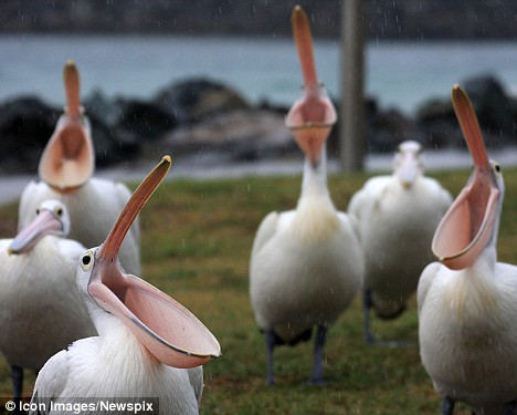 近日澳大利亞悉尼新南威爾士州普降小雨,這讓一群年幼的鵜鶘欣喜若狂,它們紛紛張口大嘴,享受雨水的“洗禮”。這一幕看起來非常滑稽,仿佛這些鵜鶘是為了將雨水存起來在沒雨的日子里使用一樣。