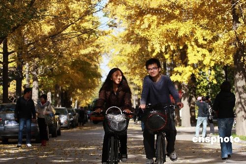 在北京林業(yè)大學(xué)校園里,金黃色的銀杏樹(shù)吸引了眾多游人。中新社發(fā) 鄭雄增 攝