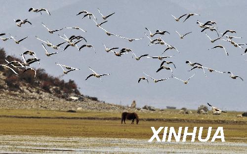11月5日,斑頭雁從納帕海周邊的上空飛過。近年來,云南香格里拉縣藏語意為“森林旁邊的湖”的納帕海,成為黑頸鶴、斑頭雁、黃鴨等鳥類的越冬樂園,每年有數(shù)萬只候鳥來此越冬。新華社記者鄒崢攝