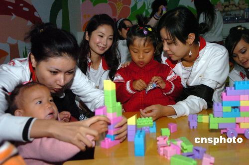 10月24日,“璽萌杯”第57屆世界小姐總決賽中國賽區(qū)參賽佳麗,來到北京豐臺區(qū)兒童福利院,把她們的笑容和愛心帶給這里的孩子們。大賽贊助商“璽萌”公司向福利院捐贈了十萬元資金。中新社發(fā) 樊建恩 攝