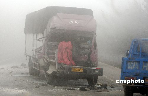 10月26日上午,罕見的秋季大霧彌漫河北省全景,高速公路全線封閉;寧晉縣附近狹窄的鄉(xiāng)間公路上兩輛貨運(yùn)卡車在能見度不足20米的惡劣條件下爭(zhēng)道相撞,造成人員物資嚴(yán)重?fù)p失。每年秋末冬初,中國(guó)北方、特別是華北平原一帶經(jīng)常會(huì)出現(xiàn)大霧天氣。中新社發(fā) 任晨鳴 攝