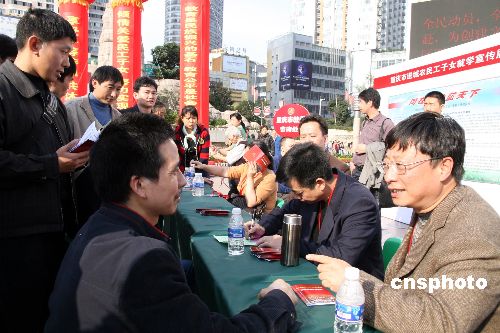 11月2日,重慶市教委為該市農(nóng)民工子女就學舉行大型咨詢活動,眾多當?shù)剡M城務工人員前來咨詢學校招生、轉(zhuǎn)學等問題。據(jù)悉,此次咨詢活動是該市政府為迎接首個“重慶農(nóng)民工日”舉行的系列活動之一。中新社發(fā) 郭晉嘉 攝