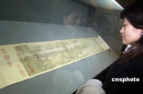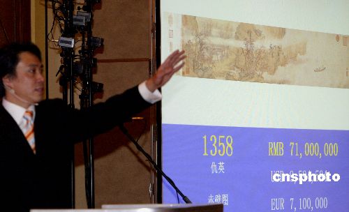 11月6日晚,中國嘉德2007秋季拍賣會(huì)的國寶級拍品明代仇英《赤壁圖》,最終以7952萬元人民幣(含傭金)的天價(jià)成交,創(chuàng)下中國繪畫作品(包括所有中國書畫和油畫作品)拍賣的世界紀(jì)錄。據(jù)悉,該作品由中國內(nèi)地買家競得。此幅作品受到藏家的極大關(guān)注,拍賣現(xiàn)場氣氛非常熱烈,拍賣師報(bào)出4000萬元人民幣的起價(jià)后,隨即就有買家舉牌應(yīng)價(jià)。此后,現(xiàn)場買家與委托席叫價(jià)此起彼伏,競價(jià)不斷飆升,爭奪趨于白熱化,最終以7100萬元人民幣的價(jià)格落槌。中新社發(fā) 張煒 攝