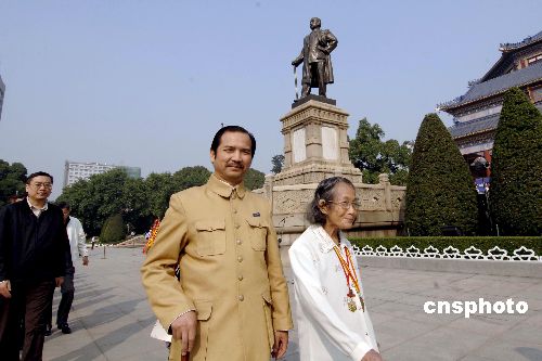 十一月十二日,廣州市各界人士在廣州中山紀(jì)念堂廣場孫中山先生銅像前,舉行紀(jì)念孫中山先生誕辰141周年紀(jì)念活動,并向?qū)O中山先生銅像敬獻(xiàn)花籃。圖為扮演孫中山先生的演員和社會知名人士參加了紀(jì)念儀式。中新社發(fā) 劉衛(wèi)勇 攝