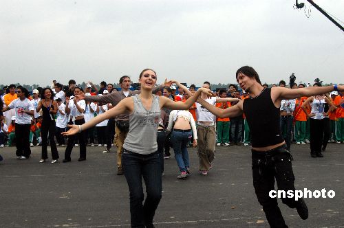 2007年11月16日,外國朋友在海南瓊海跳起歡樂之舞。為期三天的第八屆中國海南歡樂節(jié)將于當天下午開幕,海南全省放假一天。當天上午,出席開幕式的各國朋友和海南各族群眾在歡樂節(jié)主會場情不自禁地跳起歡樂之舞。中新社發(fā) 蒙鐘德 攝