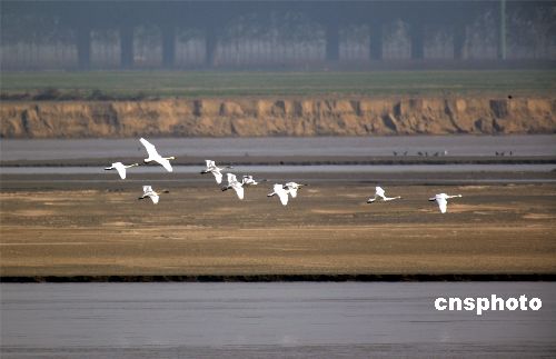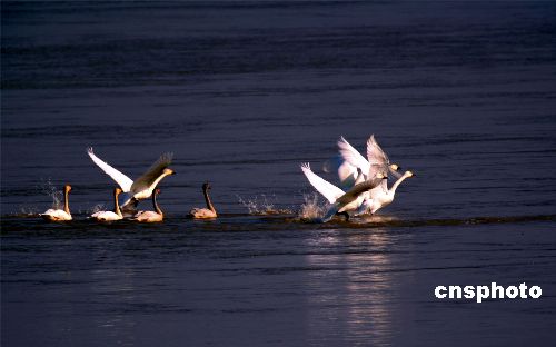十一月二十日,來自北方的大天鵝在鄭州黃河上空飛翔、在水中嬉戲。這是今年入冬以來,發(fā)現(xiàn)的大天鵝最大的種群。連日來,鄭州黃河濕地保護(hù)區(qū)工作人員連續(xù)在保護(hù)區(qū)內(nèi)進(jìn)行鳥情觀察,共發(fā)現(xiàn)國家二級保護(hù)動物大天鵝九十三只和灰鶴兩只,以及大種群分布的豆雁一千三百余只,綠頭鴨五百三十只,大白鷺三百三十二只。據(jù)推算,各種水鳥達(dá)到三十萬只。中新社發(fā) 慎重 攝