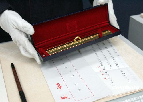 一把贈(zèng)與汪道涵先生的辜振甫夫婦金婚紀(jì)念品——金鎮(zhèn)紙,在上海成為記錄海峽兩岸交流的珍貴見證,并將于十二月十一日在“跨越海峽 情系浦江——滬臺(tái)交流二十年影像展”中與公眾見面。圖為工作人員小心翼翼的擺放該展品。中新社發(fā) 潘索菲 攝