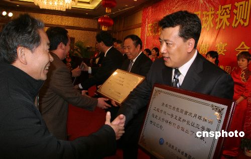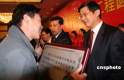中國航天科技集團公司新任副總經(jīng)理袁家軍(右)等向為該集團承擔(dān)首次月球探測工程研制任務(wù)提供幫助和支持的協(xié)作、配套單位授牌。