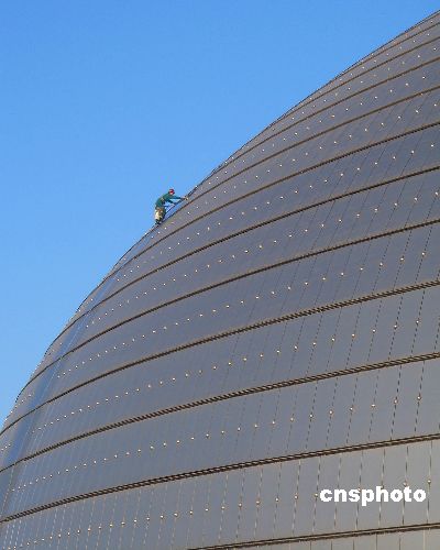 12月14日,北京國家大劇院內(nèi)外呈現(xiàn)一片繁忙景象,有關(guān)工作人員開始全面對(duì)大劇院進(jìn)行清洗、保潔,以嶄新的面貌迎接12月22日國家大劇院首個(gè)演出季的開幕盛典。中新社發(fā) 玉龍 攝