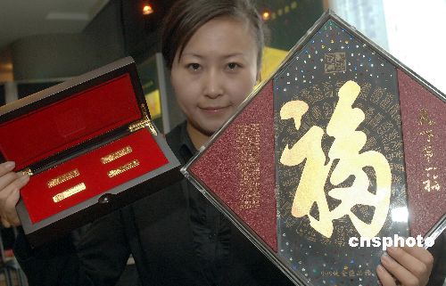 1月8日,由國道黃金發(fā)行的“中國純金壓歲錢”(禮盒)、 “中國春節(jié)金條”、“純金天下第一!钡荣F金屬產(chǎn)品在北京上市!爸袊汗(jié)金條”是一款春節(jié)氣息濃郁的賀歲產(chǎn)品,包含4根20克的金條,以最具春節(jié)代表性的餃子、爆竹、年畫、湯圓為主圖案,傳達(dá)這些春節(jié)元素的由來、歷史故事。“純金天下第一!币郧宄滴趸实塾诠1673年為祖母孝莊太后“請(qǐng)福續(xù)壽”而書寫的“福”字(被稱為“天下第一!)為主題,以純金為材質(zhì)。中新社發(fā) 鄒憲 攝