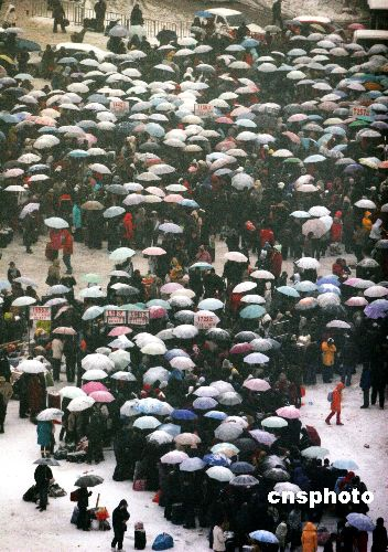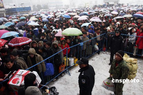 1月28日,漢口火車站廣場上客流爆滿,檢票進(jìn)站口乘客們在雪中艱難前移。武漢市連日來的強降雪給交通帶來極大不便,火車站因列車晚點、停發(fā),滯留了大量的旅客。中新社發(fā) 攝記 攝