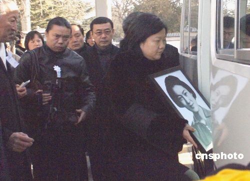 圖為遺體告別儀式后,章含之女兒洪晃(右)手捧母親遺像踏上靈車為母親送行。