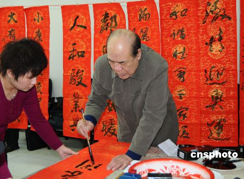 2月1日,中國(guó)書法家協(xié)會(huì)組織著名書法家二十余人到北京近郊農(nóng)村書寫春聯(lián),把喜慶送到普通農(nóng)民家庭。中新社發(fā) 楊佐桓 攝