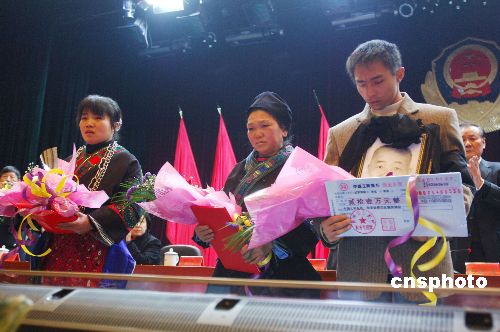 2月4日,貴州省委、省政府召開電視電話會(huì)議,表彰抗雪災(zāi)犧牲在崗位上的民警歐光權(quán)。歐光權(quán)是貴州省臺(tái)江縣看守所民警,在抗雪災(zāi)一線超負(fù)荷工作,1月21日因積勞成疾突發(fā)腦溢血倒在崗位上,經(jīng)搶救無效光榮犧牲,終年57歲。2月2日,公安部部長孟建柱簽署命令,追授歐光權(quán)為全國公安二級(jí)英模。表彰會(huì)上有關(guān)領(lǐng)導(dǎo)一次性向歐光權(quán)的家屬頒發(fā)獎(jiǎng)金21萬元。中新社發(fā) 吳東俊 攝