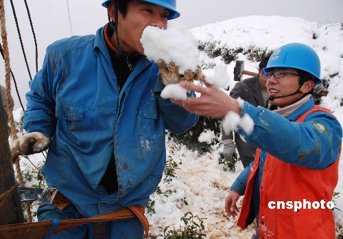 2月6日,電力搶修隊員在海撥600米的高山雪地里吃年夜飯。據悉,近日雪災造成浙江嵊州21條主要供電線路中斷供電,該市供電局每天出動500余人進行抗災自救。2月6日,該市供電局200多名黨員干部組成6支電力搶修突擊隊員,對該市貴門、里南、長樂3個未通電鄉(xiāng)鎮(zhèn)開展春節(jié)供電大會戰(zhàn),當晚6時前,該市全面修復供電,實現(xiàn)新春零斷電。中新社發(fā) 張亮宗 攝