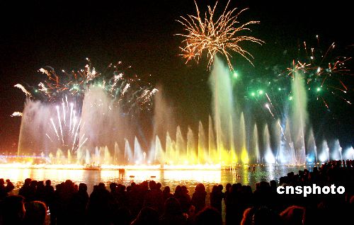 2月8日晚,蘇州金雞湖畔的水景音樂噴泉與璀璨焰火交相輝映。春節(jié)期間,蘇州工業(yè)園區(qū)金雞湖畔每晚一場的大型水景音樂噴泉與焰火表演熱鬧非凡,為節(jié)日之夜營造出濃濃的喜慶氛圍,吸引了數(shù)千市民及游客蜂擁而至到場觀看。中新社發(fā) 蘇秀 攝