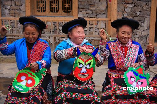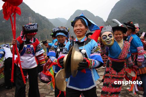 2月8日,大年初二,貴州省興義市間歇泉民族村布依族、苗族風(fēng)情演出隊(duì)在表演自編自導(dǎo)的民族舞蹈。當(dāng)日,貴州省興義市間歇泉民族村村民自發(fā)在村里組織了一臺(tái)自編自導(dǎo)的民族風(fēng)情表演及體育活動(dòng),拉開了山寨鬧新春,迎奧運(yùn)的序幕。中新社發(fā) 韋波 攝