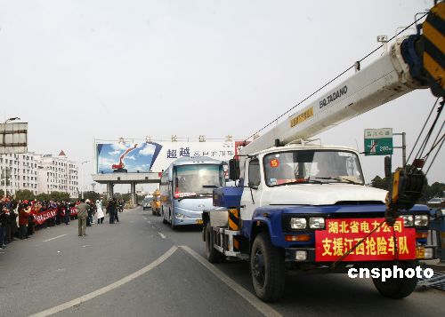 2月10日上午11時(shí)許,由171輛車組成的湖北支援江西電網(wǎng)的搶修車隊(duì)通過(guò)九江長(zhǎng)江大橋抵達(dá)江西,搶修人員將趕赴咸夢(mèng)線的搶修工地,修復(fù)咸夢(mèng)線江西段134公里長(zhǎng)受損電網(wǎng)。中新社發(fā) shendudu 攝