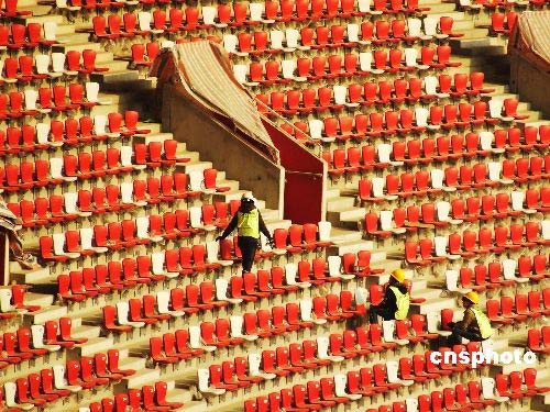 2月18日,工人們正在國(guó)家體育場(chǎng)“鳥巢”內(nèi)清潔座椅。北京2008年奧運(yùn)會(huì)主會(huì)場(chǎng)——國(guó)家體育場(chǎng)“鳥巢”8萬個(gè)固定座椅已于1月底安裝完工,這意味著北京國(guó)家體育場(chǎng)“鳥巢”的建設(shè)工程已接近尾聲。中新社發(fā) 鄭雄增 攝