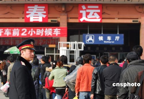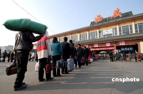 2月19日,旅客在西安火車站排隊(duì)有序進(jìn)站乘車。元宵節(jié)將至,外出民工與返校學(xué)生流、探親流等客流全面啟動(dòng),西安火車站客流持續(xù)攀升。鐵路部門采取提前二小時(shí)進(jìn)站、在廣場設(shè)立臨時(shí)候車區(qū)等措施,做好旅客乘車組織及服務(wù)工作,確?土鞲叻灏踩、平穩(wěn)、有序。中新社發(fā) 唐振江 攝