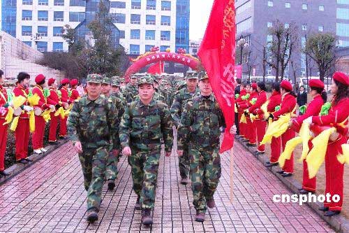 2月25日下午,湖南省郴州市委、市政府、郴州軍分區(qū)舉行盛大儀式,歡送支援郴州抗冰救災的部隊官兵離開郴州,數(shù)萬市民冒著細雨前往郴州五嶺廣場為子弟兵送行。中新社發(fā) 賀茂峰 攝
