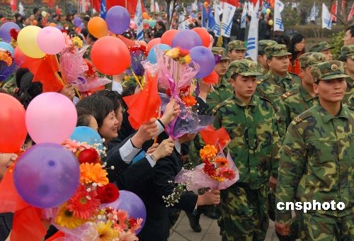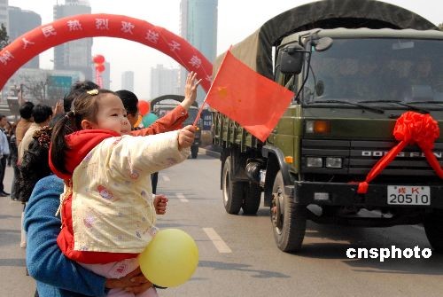 2008年3月5日,貴陽(yáng)市人民廣場(chǎng),援黔抗凝凍部隊(duì)返程受到社會(huì)各界人民群眾夾道歡送。據(jù)悉,貴州省在受凝凍災(zāi)害期間,得到中國(guó)人民解放軍及社會(huì)各界的援助,電力搶修按預(yù)期提前190余天完成,目前貴州送往省外的電路全部投入送電。中新社發(fā) 張?zhí)炝?攝