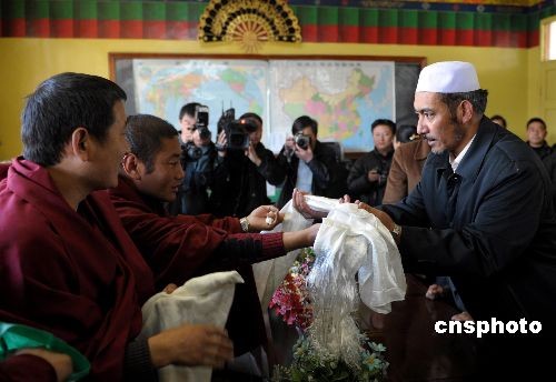 拉薩大昭寺僧人向大清真寺阿訇獻(xiàn)哈達(dá)