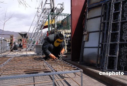 三月二十四日,拉薩市內(nèi)集中經(jīng)營(yíng)防盜門窗的市場(chǎng)內(nèi),工人正趕制產(chǎn)品。近來,拉薩防盜門窗業(yè)務(wù)激增。中新社發(fā) 廖攀 攝