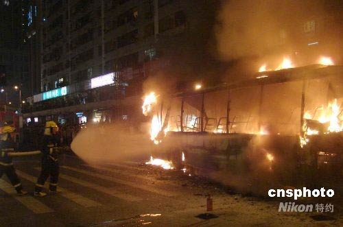 四月九日晚二十一時(shí)三十分許,重慶市區(qū)一輛載有十余名乘客的公交車在行進(jìn)中起火燃燒。消防人員迅速趕到現(xiàn)場(chǎng)撲救,由于乘客疏散及時(shí),未造成人員傷亡。出事公交車燒得面目全非,起火原因在進(jìn)一步調(diào)查中。中新社發(fā) 萬(wàn)明 攝