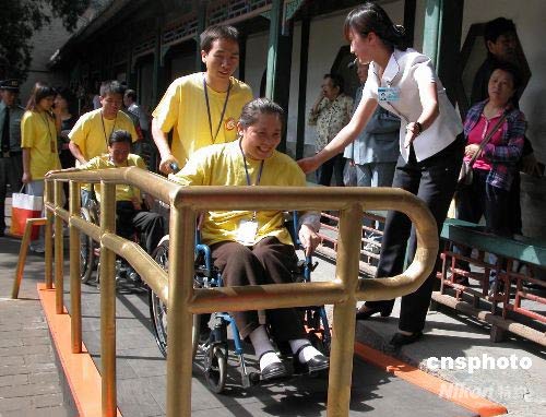 5月8日,60多名殘疾人在志愿者“一對一”的照顧下,來到北京頤和園感受古老皇家園林的魅力,更體驗現(xiàn)代無障礙設施帶來的便捷。頤和園近日修筑了兩條總長約10公里的環(huán)形無障礙旅游線路,將經(jīng)過公園內(nèi)25處最著名景點。在兩條環(huán)形通道行進方向還安裝了42塊無障礙導向指示牌,殿堂區(qū)安裝了16處無障礙坡道,建造了殘疾人獨立衛(wèi)生間7處,裝有自動開關(guān)電動門及自動報警裝置,其余的衛(wèi)生間也全部設有殘疾人設施。園內(nèi)還增設了3處殘疾人專用電話亭。圖為殘障人士在志愿者的協(xié)助下通過無障礙坡道。 中新社發(fā) 杜燕 攝