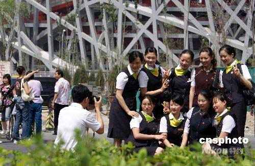 2008年5月8日上午,人們?cè)凇傍B巢”拍照留念。當(dāng)天中國(guó)登山隊(duì)隊(duì)員將奧運(yùn)圣火成功送上珠峰,創(chuàng)造了奧運(yùn)圣火首次登頂世界最高峰的紀(jì)錄。北京國(guó)家體育場(chǎng)(“鳥巢”)周圍聚滿了市民和各地游客,人們紛紛到此拍照留影,紀(jì)念北京奧運(yùn)圣火成功登頂珠峰。一些國(guó)外媒體特意在報(bào)道“鳥巢”周圍喜慶的奧運(yùn)氣氛。中新社發(fā) 馬小剛 攝
