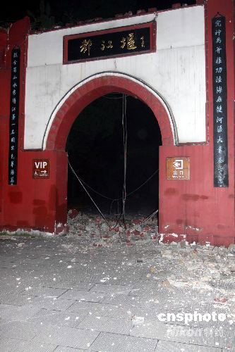 5月12日14時(shí)28分,在四川汶川縣(北緯31度,東經(jīng)103.4度)發(fā)生7.8級(jí)地震。都江堰市區(qū)受地震災(zāi)害影響嚴(yán)重,多處房屋倒塌。圖為都江堰景區(qū)受損的大門。 中新社發(fā) 黃榮 攝