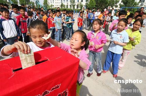 5月13日,新疆哈密新華私立學校開展向四川汶川地震災區(qū)捐款活動,得到孩子們的積極響應,學生們踴躍為地震災區(qū)捐款獻愛心。中新社發(fā) 普拉提 攝