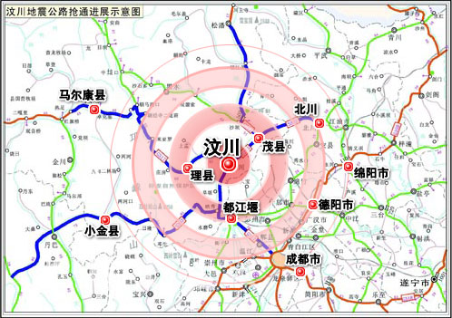 據(jù)來(lái)自交通運(yùn)輸部的消息,目前,四川省內(nèi)所有高速公路均已恢復(fù)正常通行,成都、德陽(yáng)、綿陽(yáng)、雅安等受災(zāi)地區(qū)的主要干線(xiàn)公路也已搶通。但都江堰至汶川、理縣至汶川、茂縣至汶川、臥龍和映秀至汶川的公路損毀極為嚴(yán)重,交通部門(mén)正同時(shí)從東西南北四個(gè)方向全力搶通前往汶川的受損公路。