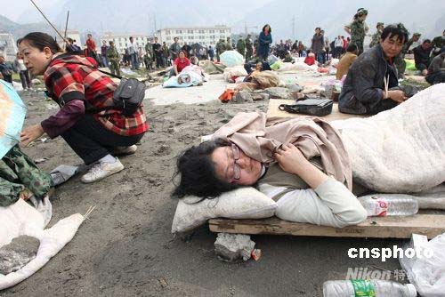 5月15日,等待救助的汶川縣災民。由于陸路交通尚未恢復,重傷員只能等待直升機轉(zhuǎn)運到成都救治。中新社發(fā) 張雷 攝