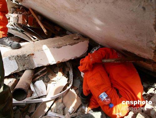 十五日十四時(shí),福州消防支隊(duì)赴川抗震救災(zāi)官兵在青川縣賓和路一家主建筑已全部坍塌的大型汽車維修廠,用生命探測(cè)儀成功解救出一名被困女工。當(dāng)時(shí),在接群眾求助后,救援隊(duì)立即趕赴現(xiàn)場(chǎng),搜索分隊(duì)首先用生命探測(cè)儀確定了女工被困的大概方位,救援分隊(duì)迅速啟動(dòng)救生氣墊,并用鐵鍬和雙手以土工的方式為被困女工打開了一條生命通道,半個(gè)小時(shí)后,被困女工被成功救出。中新社發(fā) 朱曉航 攝