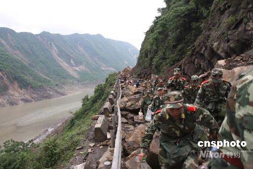來自交通運輸部的最新消息,從北、東、南三個方向通往汶川的道路目前仍在緊急搶修中。已全線搶通的西線道路因再次發(fā)生滑坡、泥石流災害,受損十分嚴重,目前塌方路段能夠維持通行,但隱患較多。圖為5月14日逾千官兵徒步緊急趕往受災嚴重的映秀鎮(zhèn)情景。中新社發(fā) 黃榮 攝