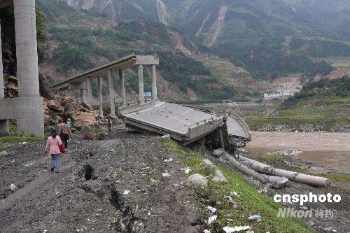 四川大地震,都江堰到汶川縣映秀鎮(zhèn)沿線民房和交通受損嚴(yán)重,許多受困的居民紛紛離家趕往安全地點(diǎn),也有許多居民想回家看望地震區(qū)的親人。圖為都汶高速的百花大橋20米左右被地震震垮,多處橋墩受損壞。中新社發(fā) 黃榮 攝
