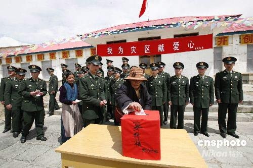 5月16日,駐守在海拔4500多米的青藏兵站部某大站黑河兵站官兵拿出津貼向四川災(zāi)區(qū)民眾獻上一份愛心。兵站的藏族職工索朗嘎姆、加里等也加入了捐款行列。中新社發(fā) 鄒小慶 攝