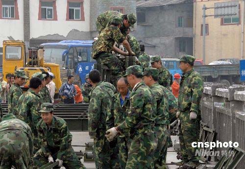 5月16日,由都江堰都往汶川的壽江公路大橋因地震山體移位造成橋面傾斜,車輛和機(jī)械無(wú)法通行。四川雅安民兵專業(yè)應(yīng)急分隊(duì)奉命迅速趕赴事發(fā)地點(diǎn),利用制式公路鋼橋?qū)κ軗p橋梁進(jìn)行加固。中新社發(fā) 吳蘇琳 攝