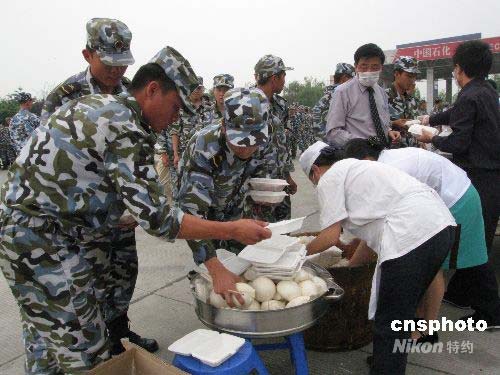 五月十六日十二點(diǎn)二十分許,一支從海南星夜兼程趕來的、有一千余名官兵組成的抗震救災(zāi)隊(duì)伍到達(dá)成都成南高速路口加油站,早早等候在這里的成飛賓館工作人員,迅速為戰(zhàn)士們提供上盒飯、饅頭等飯菜。僅二十分鐘戰(zhàn)士們就用完飯菜,稍事休整后就出發(fā)趕往受災(zāi)。中新社發(fā) 周丹鈺 攝