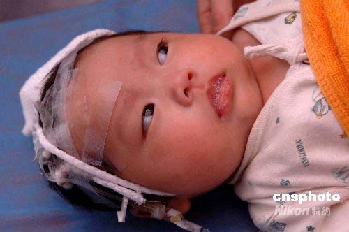 2008年5月17日下午,四川大學(xué)華西醫(yī)院抗震救災(zāi)急診部門(mén),接來(lái)一位出生剛80天,來(lái)自地震重災(zāi)區(qū)四川綿竹的女?huà)耄拿纸辛戊o萱。廖靜萱目前腦部出現(xiàn)腦水腫,可能將要進(jìn)行腦部手術(shù),其右腿也帶有地震創(chuàng)傷。中新社發(fā) 鄒憲 攝