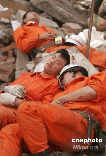 5月17日,在四川省什邡市鎣華鎮(zhèn)、紅白鎮(zhèn)等搶險(xiǎn)現(xiàn)場(chǎng),連續(xù)作戰(zhàn)的洛陽消防搶險(xiǎn)救援突擊隊(duì)隊(duì)員們躺在瓦礫上小憩片刻。在四川地震災(zāi)區(qū),解放軍、武警、公安、邊防、消防官兵以及民兵、醫(yī)療救護(hù)人員和志愿者們,不怕危險(xiǎn),不畏疲勞,為搶救每一條寶貴的生命連續(xù)奮戰(zhàn)。他們是最可愛的人!中新社發(fā) 張曉理 攝