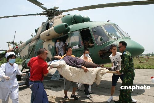 5月18日中午1時(shí)許,首批來(lái)自四川北川縣重災(zāi)區(qū)的20名受重傷群眾,被總參某陸航團(tuán)4架直升機(jī)運(yùn)到空軍駐彭山機(jī)場(chǎng),立即被送到眉山市各主要醫(yī)療單位救治。從當(dāng)天起,一大批來(lái)自北川邊遠(yuǎn)鄉(xiāng)鎮(zhèn)的重傷員將通過(guò)這條“空中生命線”接到眉山救治。中新社發(fā) 堯遙 攝