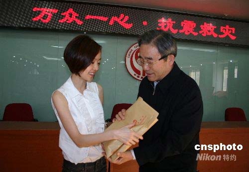 圖:陳魯豫向四川汶川地震災(zāi)區(qū)獻愛心
