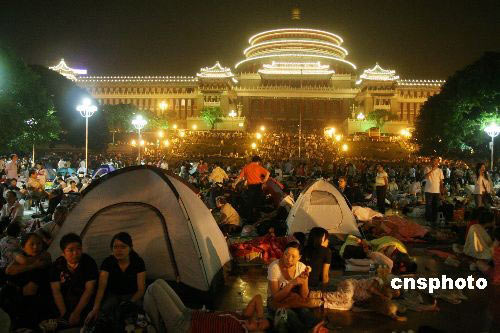 5月20日凌晨,重慶人民廣場(chǎng)內(nèi),大批當(dāng)?shù)厥忻裨诖舜罱◣づ襁^(guò)夜。19日晚21時(shí)30分許,重慶市人民政府發(fā)布信息稱(chēng),19日至20日,在汶川震區(qū)附近有可能發(fā)生6至7級(jí)余震,重慶各地將會(huì)有明顯震感。并提醒廣大市民注意安全,按防震知識(shí)做好防范工作,注意相互幫助、維護(hù)公共秩序。信息發(fā)布后,大批當(dāng)?shù)厥忻耖_(kāi)始聚集廣場(chǎng)、平地等開(kāi)闊地帶過(guò)夜。中新社發(fā) 郭晉嘉 攝