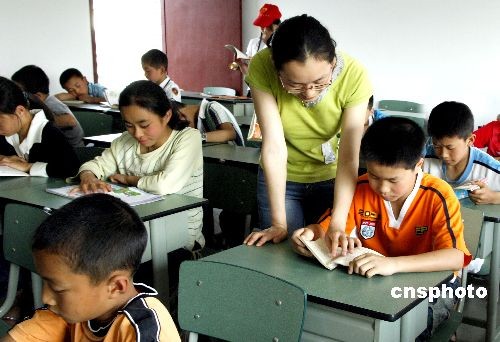 5月19日,來(lái)自地震重災(zāi)區(qū)的孩子在四川省成都市新都區(qū)“愛心學(xué)!钡恼n堂上接受老師輔導(dǎo)。全國(guó)首所專門為地震重災(zāi)區(qū)孩子開辦的“愛心學(xué)!,18日上午在四川省成都市新都區(qū)新繁鎮(zhèn)正式開課。首批就讀的166名孩子,分別來(lái)自彭州、都江堰、綿竹等重災(zāi)區(qū),有的孩子在震災(zāi)中失去了父母。新都區(qū)從各個(gè)學(xué)校抽調(diào)了近20名經(jīng)驗(yàn)豐富、有敬業(yè)精神和愛心的教師任課,并給學(xué)校安排了2名有資質(zhì)的優(yōu)秀心理健康輔導(dǎo)老師。