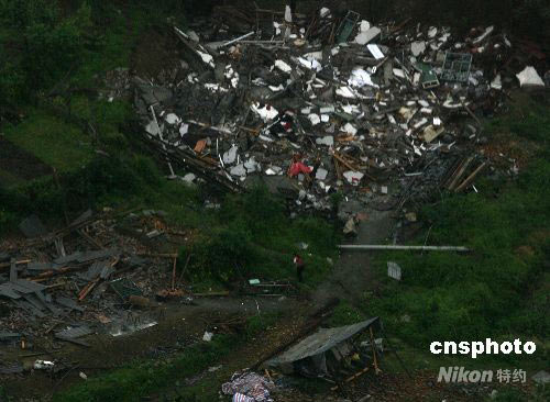五月二十一日,汶川大地震第十天,從空中可見一位偏遠(yuǎn)山村的幸存者回到地震倒塌的家園,面對廢墟。中新社發(fā) 賈國榮 攝
